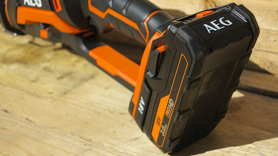 La poignée ergonomique à le revêtement soft grip offre une bonne préhension pour bien contrôler l’outil. La gâchette est bien positionnée et la sensibilité offre l'avantage de pouvoir adapter la vitesse en fonction du type de découpe à effectuer. L'utilisateur à le choix entre la fonction pendulaire qui permet d'effectuer des coupes rapides, que l'on apprécie pour les travaux de démolition ou la fonction sans le mouvement pendulaire garantit des coupes précises. La scie sabre compacte AEG fait partie de la plateforme PRO 18 V compatible avec l'ensemble des batteries de la gamme AEG 18 V et les batteries hautes performances PROHD lithium-ion de 18V, offrant une autonomie conçue pour des appareils à utilisations intensives. Lors de nos différents tests de la scie sabre compacte sans fil AEG BUS18CBL-0, nous avons utilisé la nouvelle batterie PROHD L1830RHD 3,0 Ah, qui est à la fois puissante, compacte et offre un parfait équilibre de la machine. Pour les travaux de découpes intensifs, nous conseillons la batterie PROHD L1860RHD 6,0 Ah qui dispose d'une excellente autonomie.